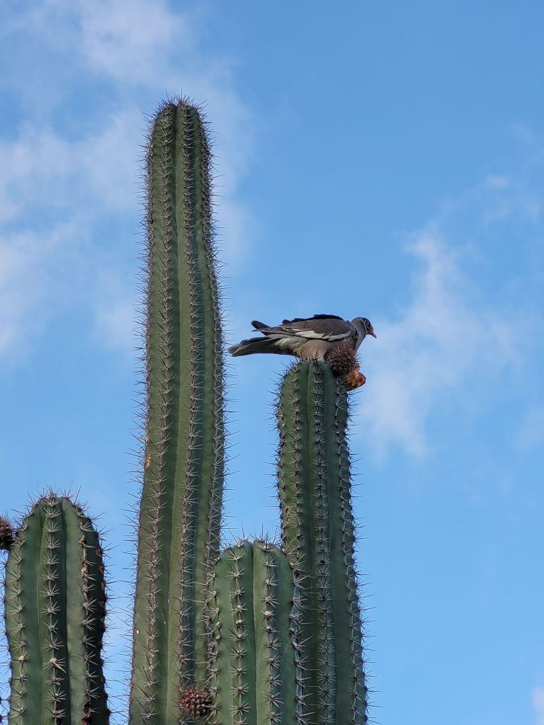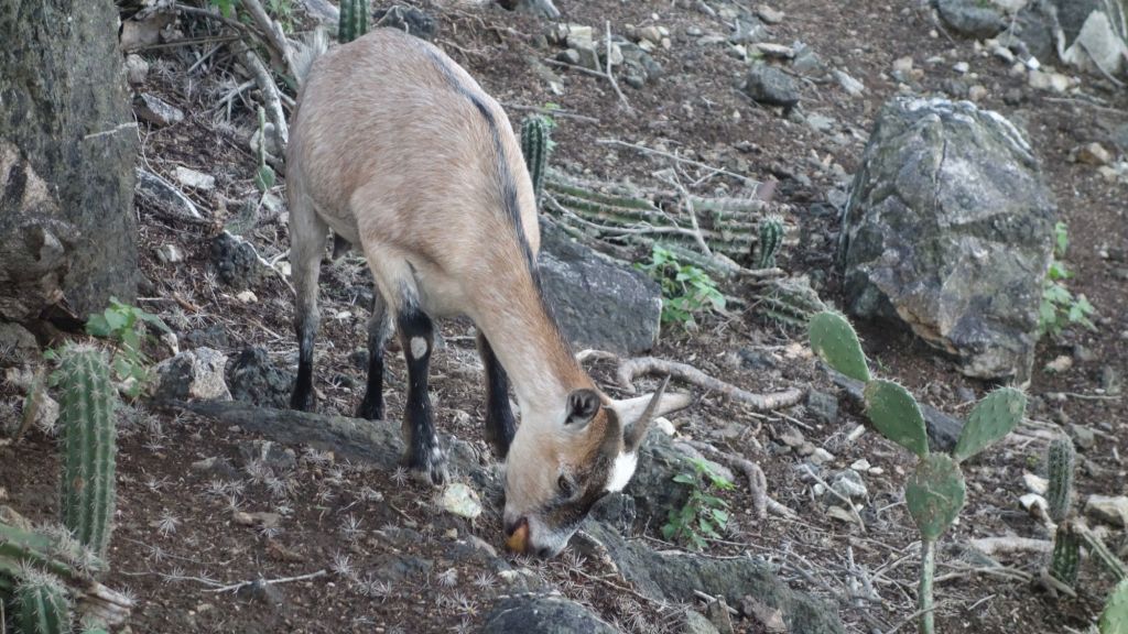 Der Abstieg wird dann abwechslungsreicher als gedacht. Zunächst streift eine Ziege durch das Unterholz. Samuel zückt natürlich sofort seine Kamera. Derweil zeigen sich immer mehr Geiße, Böcke und auch Zicklein. Manche trotten umher und fressen Kaktus(früchte), einige messen schon ihr Kräfte und eine genießt einfach nur die Morgensonne.