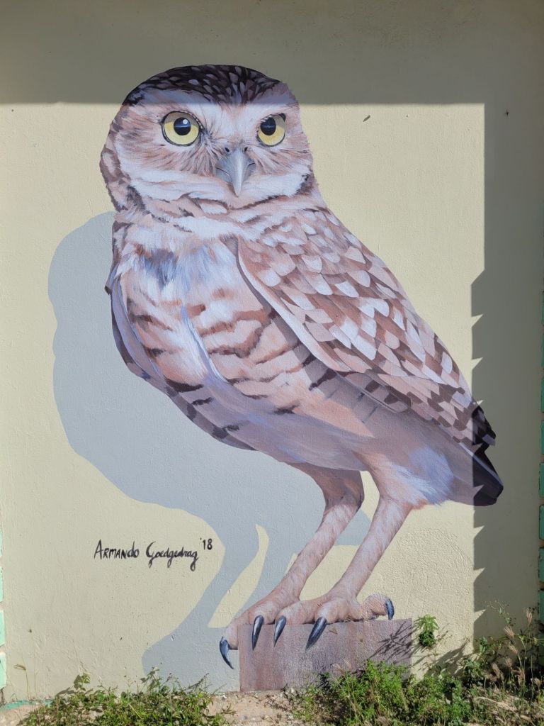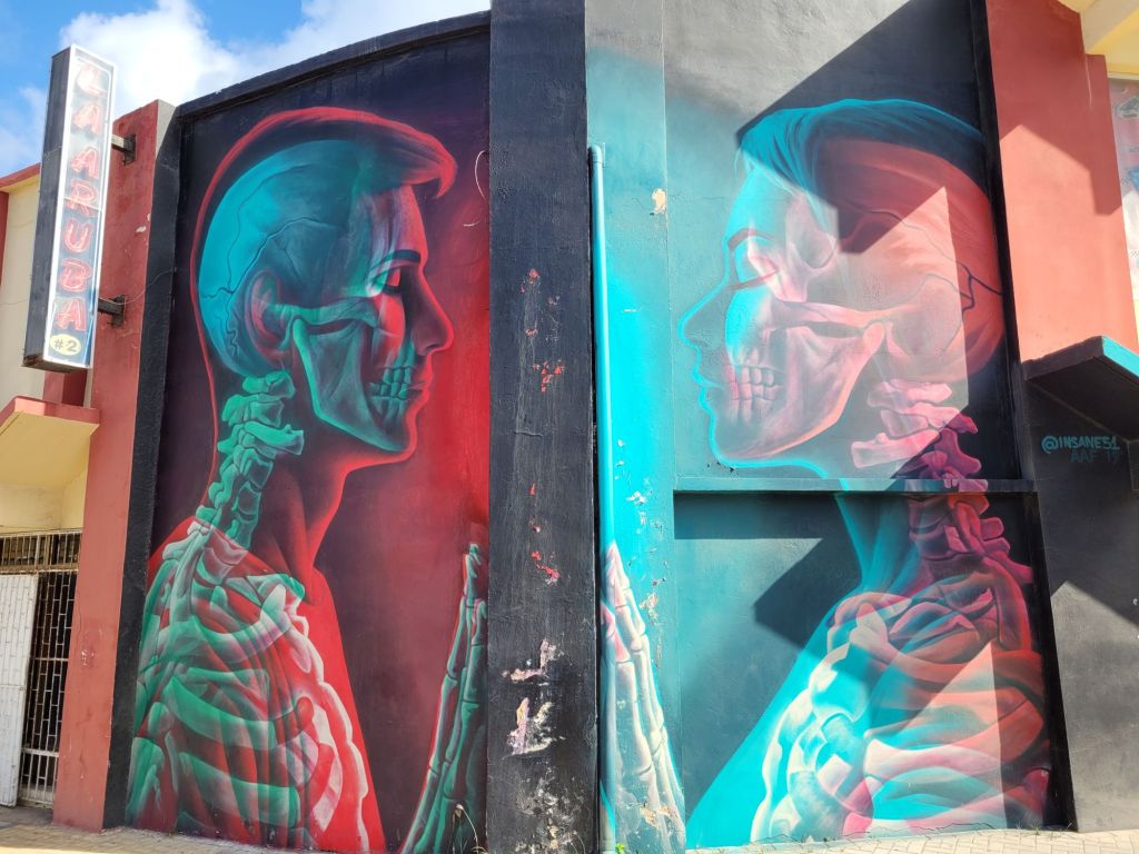 Ein über die Grenzen Aruba hinaus durchaus bekanntes Highlight ist das rot-blaue Wandbild, dessen Motiv sich je nach Farbfilter ändert… Mensch und Skelett stehen sich immer abwechseln gegenüber.