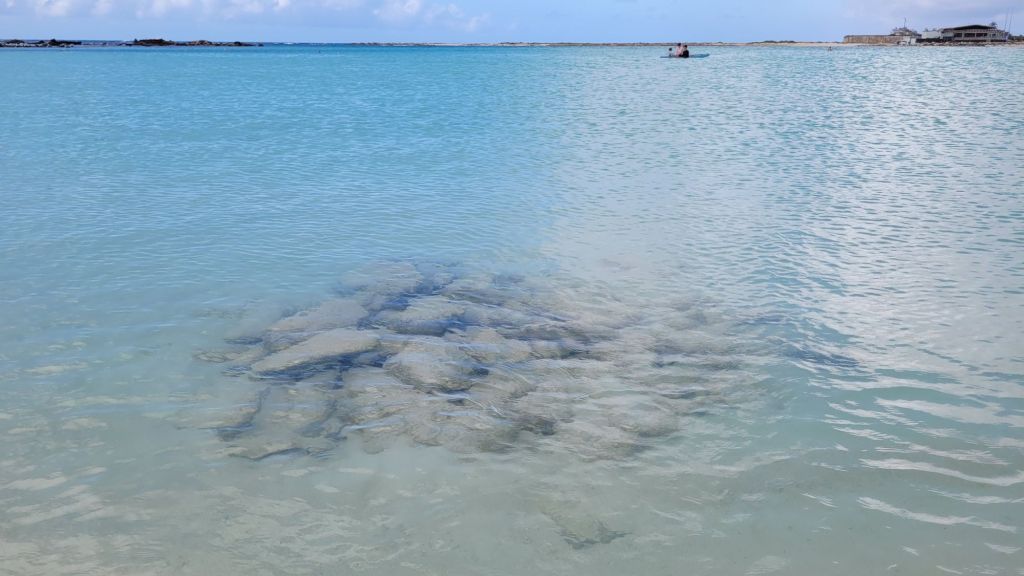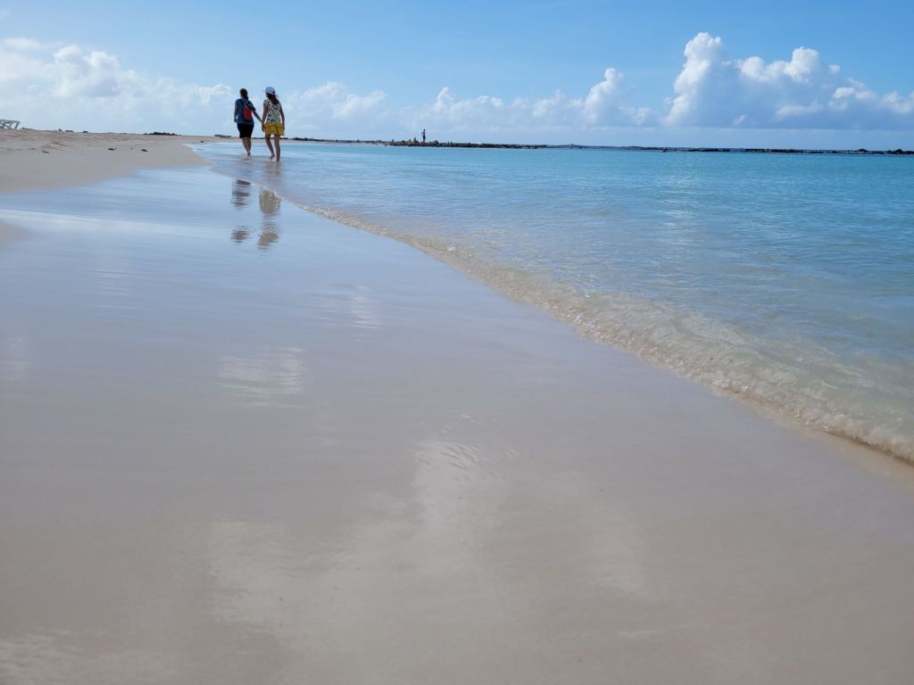Nach dem ausgiebigen Stadtrundgang fahren wir weiter zum sehr beliebten Baby Beach an der Südspitze von Aruba. Im Gegensatz zu vielen anderen schönen Stränden der Insel wuchtet sich hier keine Hotelburg in die Höhe. Also noch nicht… ein großes Plakat kündet von entsprechenden Plänen. Doch bis es soweit ist, ragen nur die Überreste der Ölraffinerie im Hintergrund gen Himmel.
