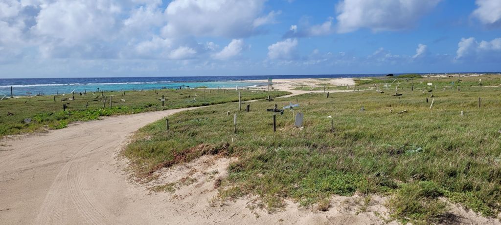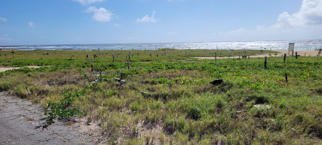Die meisten Touristen machen am Baby Beach kehrt Richtung Norden. Wir fahren noch eine kleine Runde am Ufer entlang. Was ist das? Wir stutzen. Ein Meer von Kreuzen wogt über sanfte Hügel. Sieht aus wie ein Friedhof. Hier am Strand?