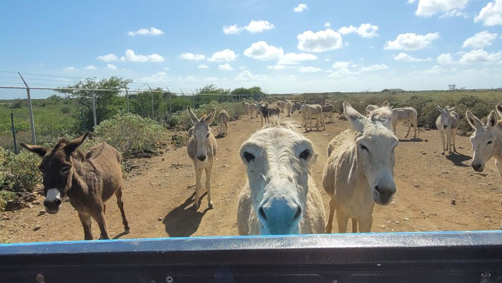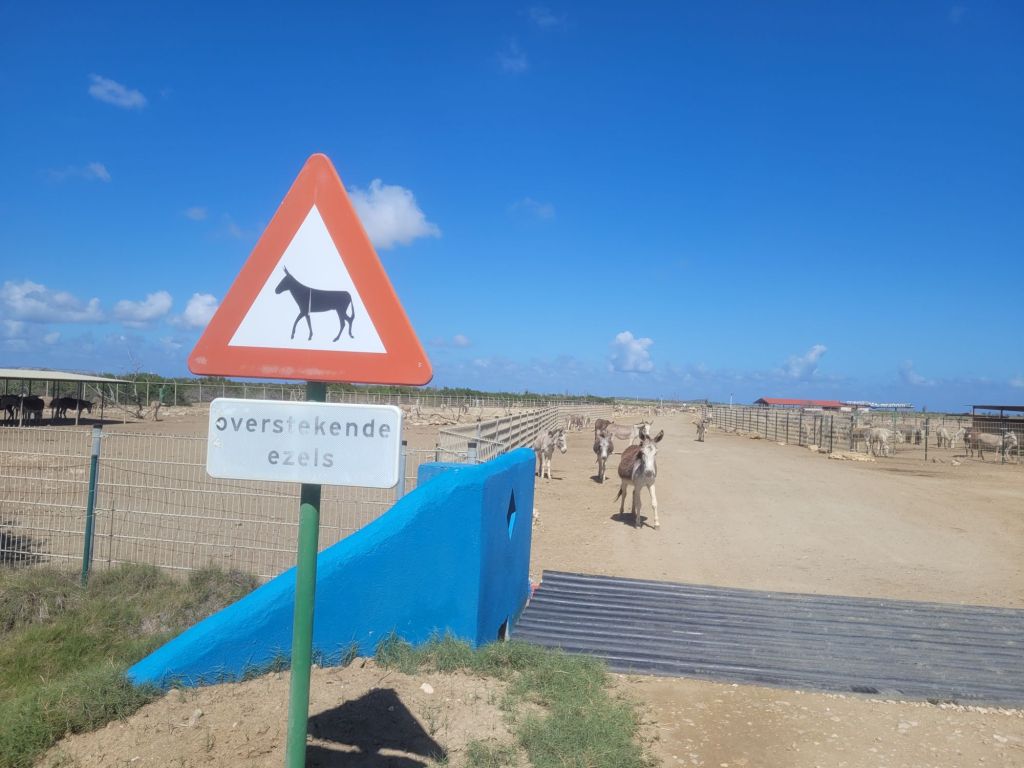 Einige werden sich denken „Ach nö… nicht schon wieder Esel!“. Wir müssen dagegen halten: „Ach ja… einmal Esel muss jetzt noch sein!“. Schließlich wurden die fleißigen Helfer dereinst nicht nur nach Aruba, sondern auch Curaçao und Bonaire gebracht. Und wo sich im zersiedelten Aruba neben den 127 Tieren im dortigen Donkey Sanctuary nur noch ein gutes Dutzend in freier Wildbahn finden, so leben hier in Bonaire schon über 700 Esel alleine im hiesigen Donkey Santuary. Und kaum verlässt man den kleinen Siedlungsbereich, säumen regelmäßig „overstekende ezels “-Schilder den Straßenrand… gerne auch mal gefolgt von einem Esel… oder mehreren… das ist eine ganz andere Dimension.