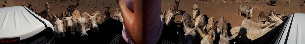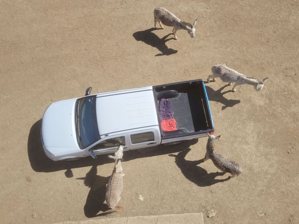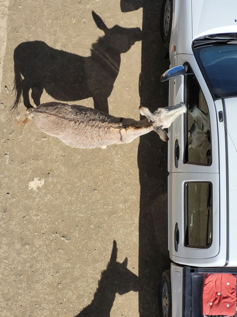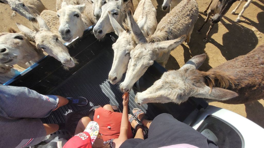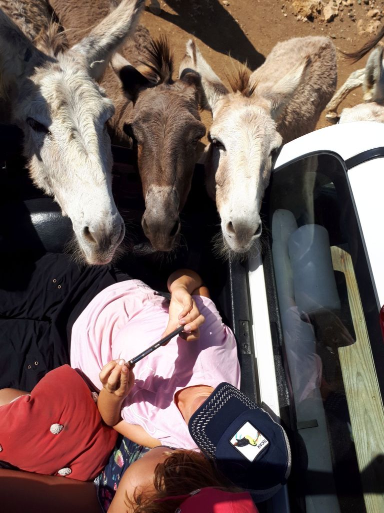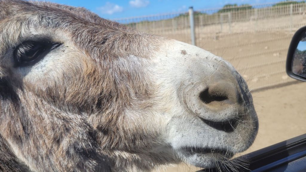 Schon auf den ersten Metern ist die schiere Massen an Eseln überwältigend. Im Schritttempo tasten wir uns voran. Natürlich mit offenen Seitenfenstern. Was liegt aus Sicht eines neugierigen Esels da näher, als kurz mal reinzuschauen. Oder auch länger. Selten allein. Drei Köpfe passen da locker gleichzeitig durch. La Skipper auf dem Beifahrersitz ist nicht ganz so begeistert und verzieht sich schon bald zu den Kindern nach hinten. Ob das wirklich die bessere Wahl ist?