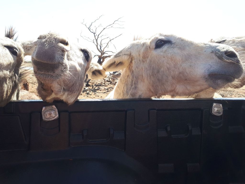 Doch auch der Rest der Samai-Crew hat hinten auf dem Pickup viel Spaß mit ihrer großen, vierbeinigen Fangemeinschaft. Es sind wirklich SEHR viele Esel hier auf dem Gelände.