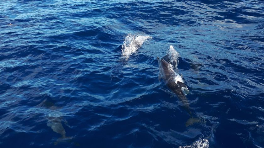Damit meine ich jedoch nicht den gestrigen Tag. Der Wind bleibt wie angesagt unter 10kn und kommt von vorne. Dazu der allgegenwärtige Gegen- oder zumindest doch Seitenstrom. Entspannt motort die Samai gemütlich ihrem Ziel entgegen, wobei am späten Nachtmittag eine Delfinschule für willkommene Abwechslung zur Bordschule sorgt.