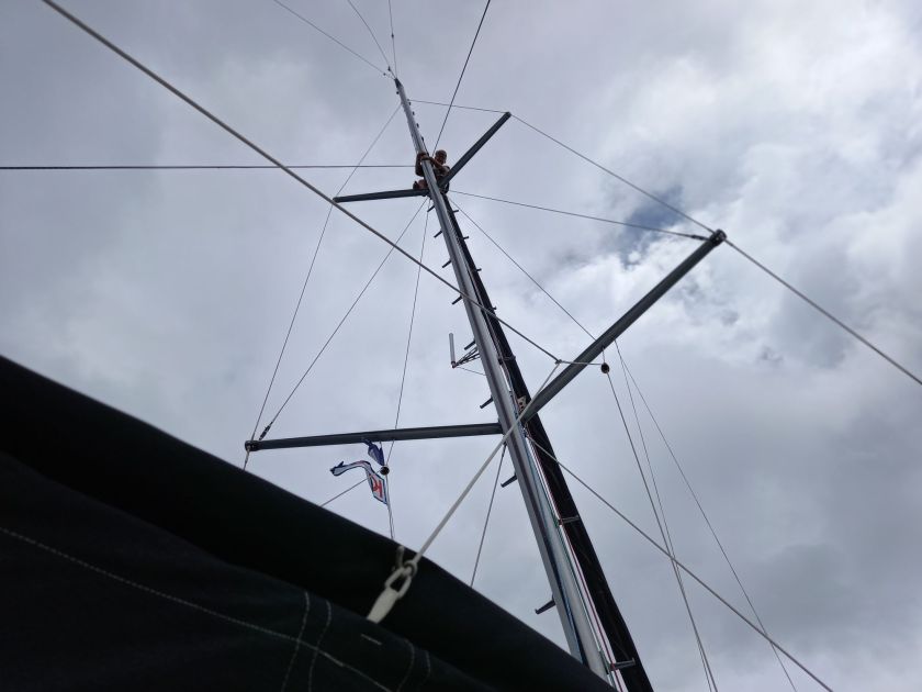 Der neue Tag beginnt ausgeschlafen, mit einem guten Kaffee, leckerem Früstück und aktuellen Wetterberichten. Es sieht sogar noch besser aus als gestern. Wenn wir mittags losfahren, sollten wir die gut 100sm bis Barbados eigentlich bei 4-5 Bft. am Wind durchsegeln können. Das wäre echt super. Doch vorher muss Samuel noch einmal in den Mast klettern. Nach dem legendären Sprung von Eike haben wir leider vergessen, die Maststufen wieder einzuklappen. Es kommt wie es kommen muss. Das Großfall hat sich verhakt. Aber für unseren erfahrenen Mastkletterer ist das nur eine Kleinigkeit.