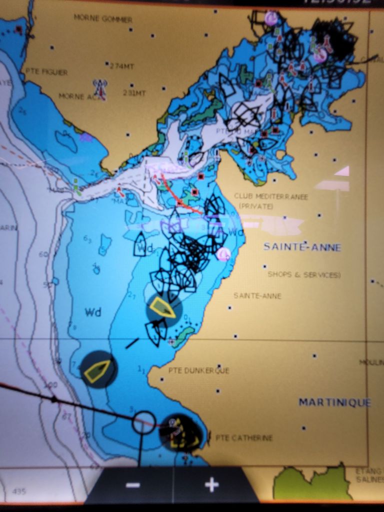 Im Süden von Martinique gibt es (unter anderem) eine größere Ankerbucht vor Sainte-Anne. Nach und nach zeigen sich darin immer mehr AIS-Signale von Ankerliegern auf dem Plotter. Es werden über vierzig! Dazu kommen dann noch die ganzen Boote ohne AIS. Wahrscheinlich gilt diese Bucht hier gerade mal als „nicht übermäßig besucht“?! Willkommen in der Karibik!