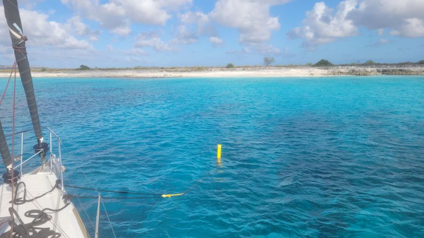 Wir tingeln weiter die gut besuchte Westküste entlang. Leider ist auch die von uns angepeilte Mooring schon von einem kleinen Boot belegt. Die Kinder stehen am Bug und halten weiter Ausschau. Da winkt uns von dem kleinen Boot, das an unserer Wunschmooring liegt, ein älterer Mann zu und fragt gestisch, ob wir hier ran möchten. Ja, das wäre echt super. Keine zwei Minuten später ist die Mooring frei. Wir winken und bedanken uns herzlich. Das Boot fährt übrigens die Flagge von Bonaire.