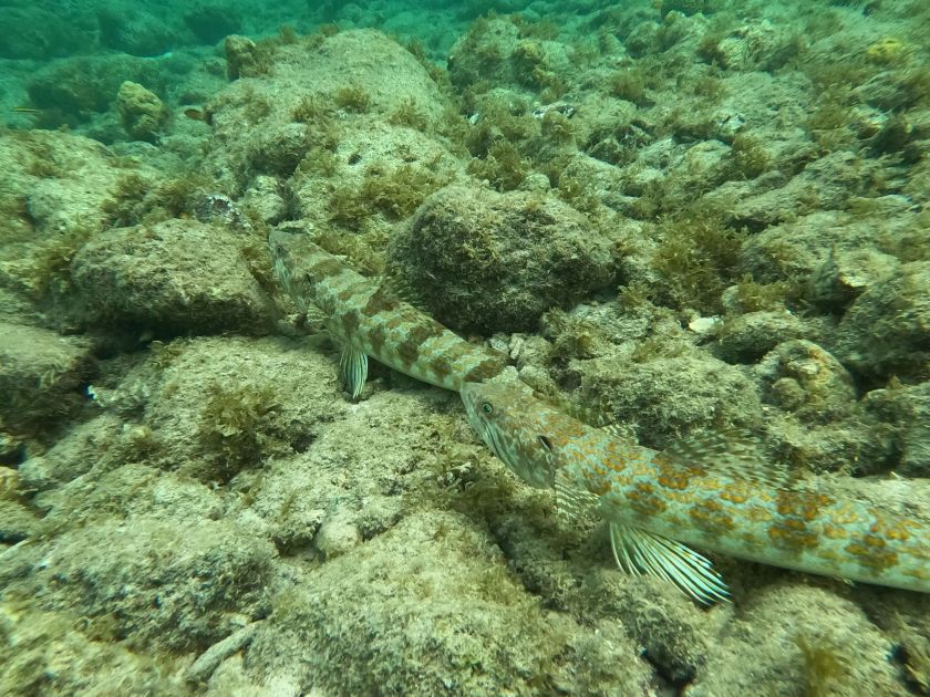 Am Boden liegen Eidechsenfische, die ganz schön grimmig schauen und auch scharfe Zähne haben. Aber sie jagen nur Beute bis zu ihrer eigenen Größe.