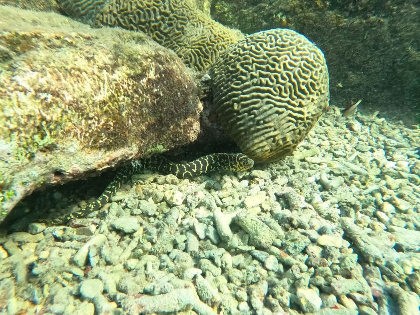 Näher am Ufer sehe ich schnell wieder die etwas gefährlicheren Fische. Eine Kettenmuräne hat ihr Versteck verlassen und auch ein junger Rotfeuerfisch schwimmt offen umher.