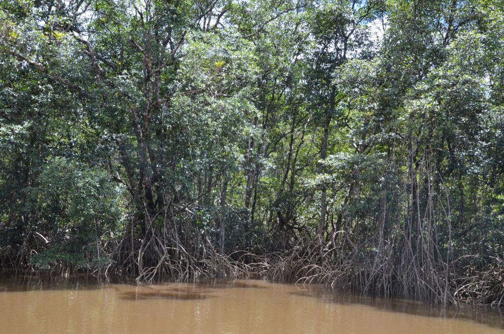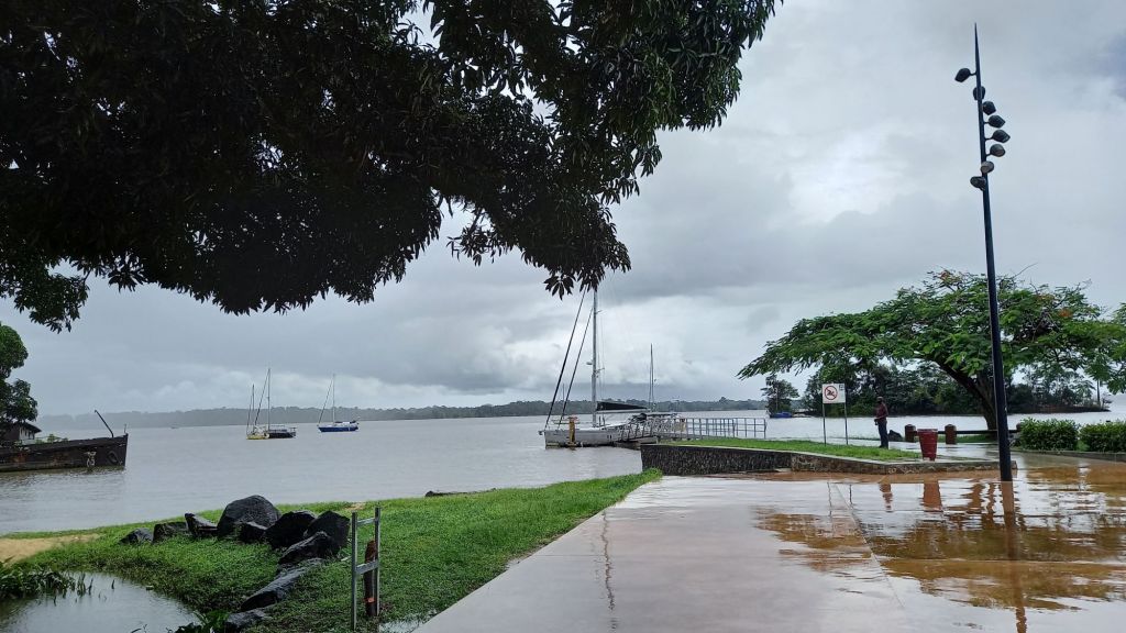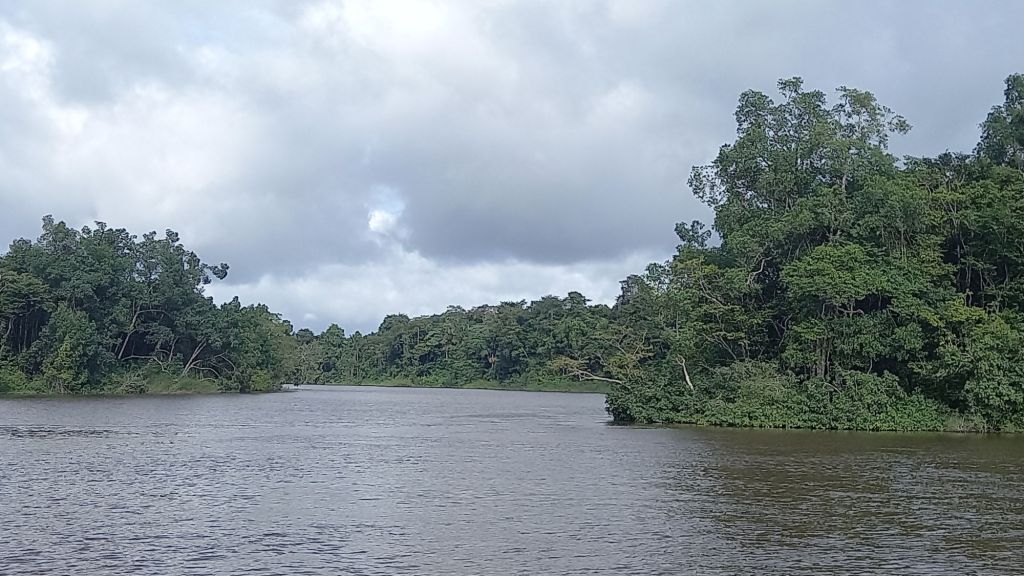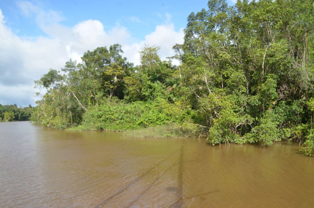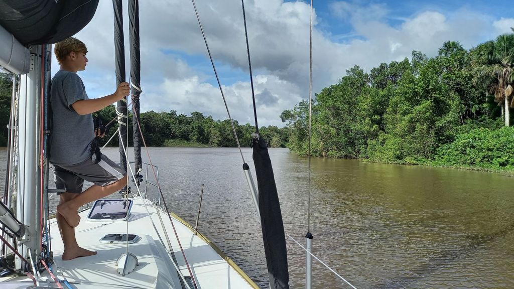 Auch wenn wir später als geplant loskommen, ist das nicht allzu schlimm. Schon 5sm nördlich unserer Mooring verlassen wir den breiten Grenzfluss Maroni und biegen in den Crique Lamentin. Jetzt wird es spannend. Natürlich gibt es auf den Karten keine Tiefenangaben in den Nebenflüssen. Doch TO-Stützpunktleiter Davide versichert uns, dass es überall tief genug sei. Lediglich an einer Stelle hat es nur gut 2m. Wir haben jedoch immer mindestens knapp 4m unter dem Lot.