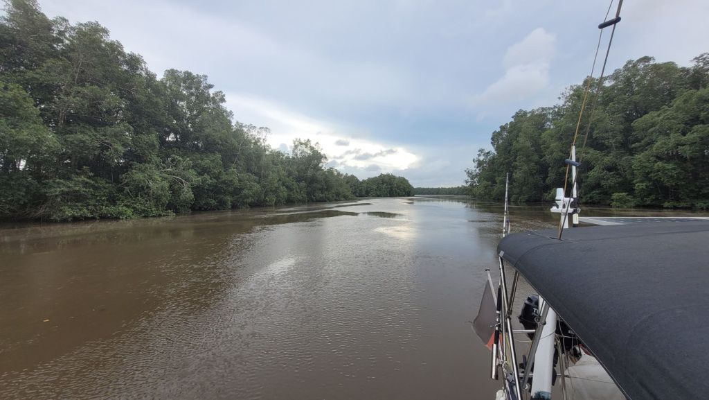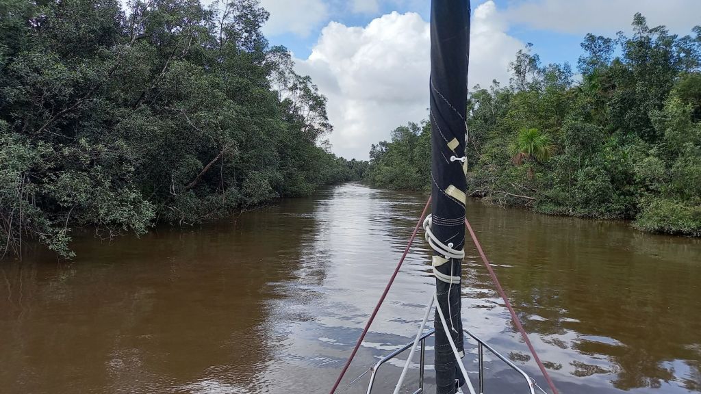 Es ist schon recht spät und der RCCPF-Cruising Guide empfiehlt einen lauschigen kleinen Nebenarm. Jetzt nicht zum ankern, aber es wäre doch gelacht, wenn wir da nicht ein Plätzchen für die Nacht finden würden. So ist es dann auch. Bei einem kleinen Zufluss wird es etwas breiter, ein Bereich mit etwa 70m im Durchmesser. Doch erst einmal fahren wir noch etwas weiter rein in den engen Nebenarm. Da kann es schon mal passieren, dass etwas Grünzeug (mit Spinnen) an Bord kommt…