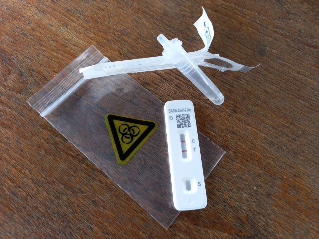 Der Skipper zeigt sich solidarisch mit seinen Kindern und fängt an zu hüsteln. Wir holen einen Schnelltests raus. Samuel hält die Nase hin. Gewissheit. Die Flüssigkeit hat den C-Streifen noch gar nicht erreicht, da leuchtet der T-Streifen grell-pink.