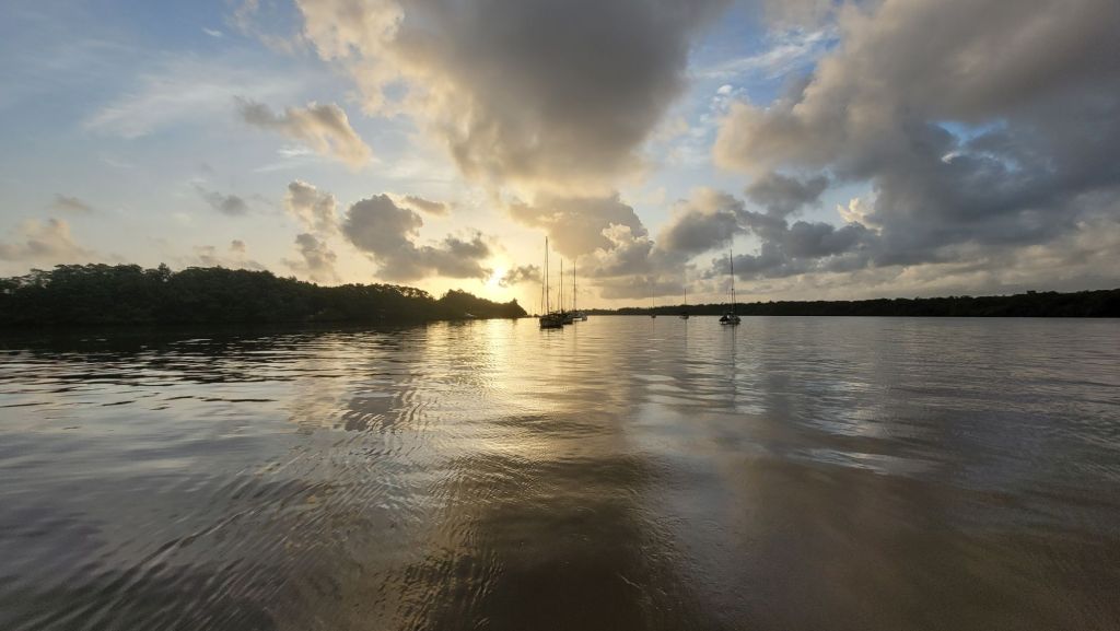 Noch vor der Dämmerung passieren wir die Îles de Salut und steuern in das Fahrwasser von Kourou. Kräftiger Seitenstrom. Erstaunlich wenig Tiefe. Mit den ersten Sonnenstrahlen erreichen wir den angepeilten Ankerplatz. Der erste Versuch gerät mir zu nahe am Nachbarboot. Beim zweiten Versuch bin ich zufrieden. Genug Abstand. Der Anker hält. Ruhe im Boot. Noch ein kurzes Kartenspiel mit den Kindern, dann falle ich ins Bett. Endlich!