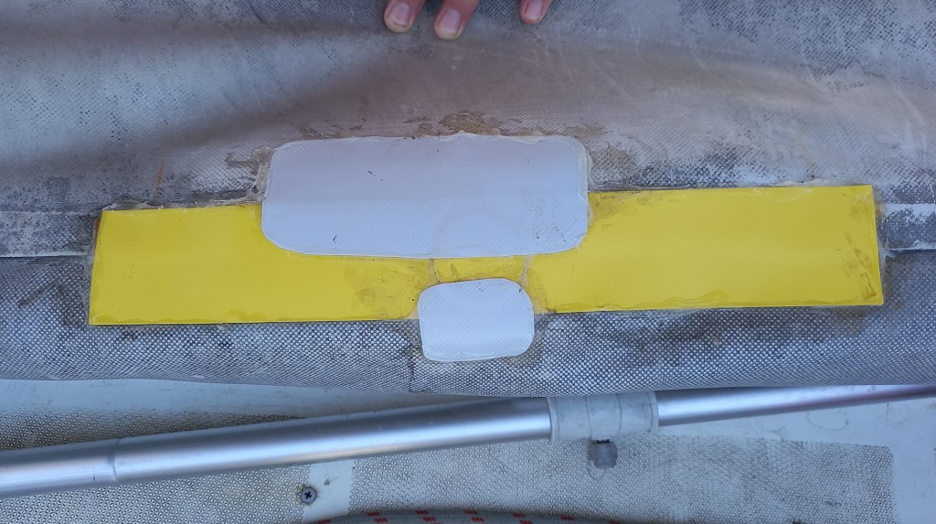 Die letzte Tube Kleber ist nicht so toll. Bleibt auch nach Stunden noch klebrig-zäh. Nicht gut. Nochmal nacharbeiten. Hoffentlich reicht das. Der Verband ist angelegt. Die Wunde soll nicht der direkten Sonneneinstrahlung ausgesetzt werden. Ein weißer, immer mal wieder befeuchteter Lappen liegt wie ein Leichentuch… nein, wie ein Verband auf der lädierten Seite. Halt durch mein Freund! Wir lieben dich!!!