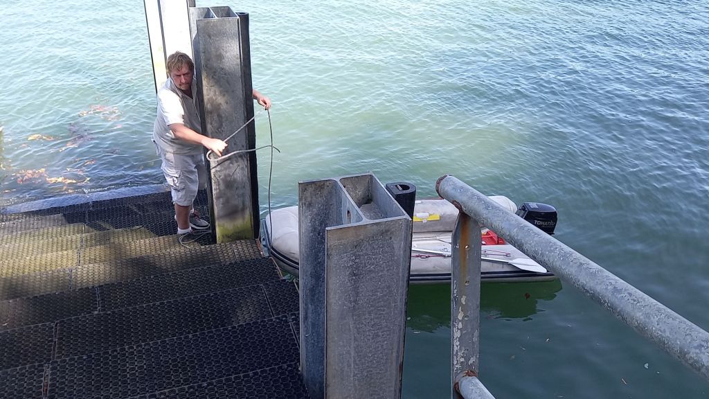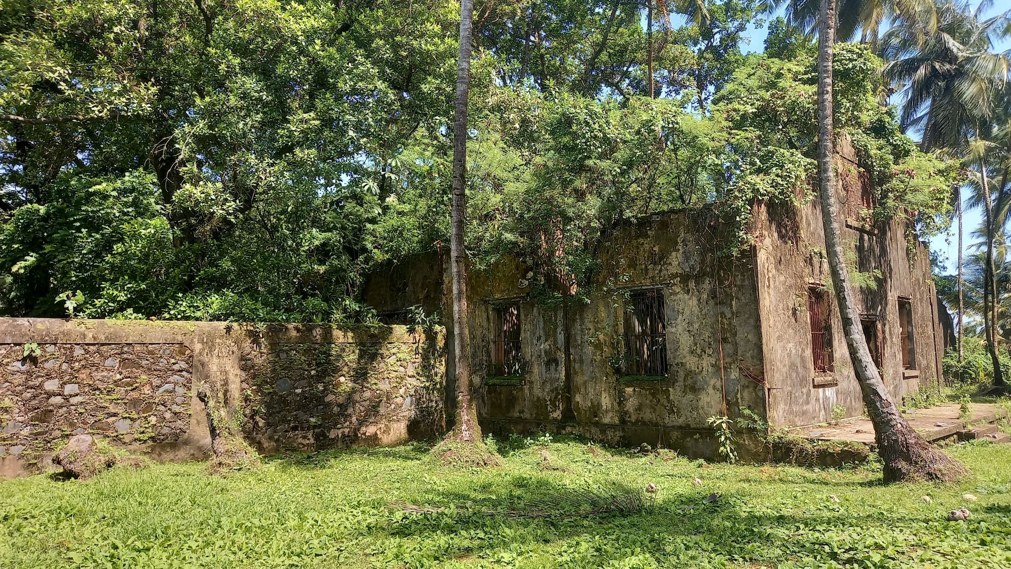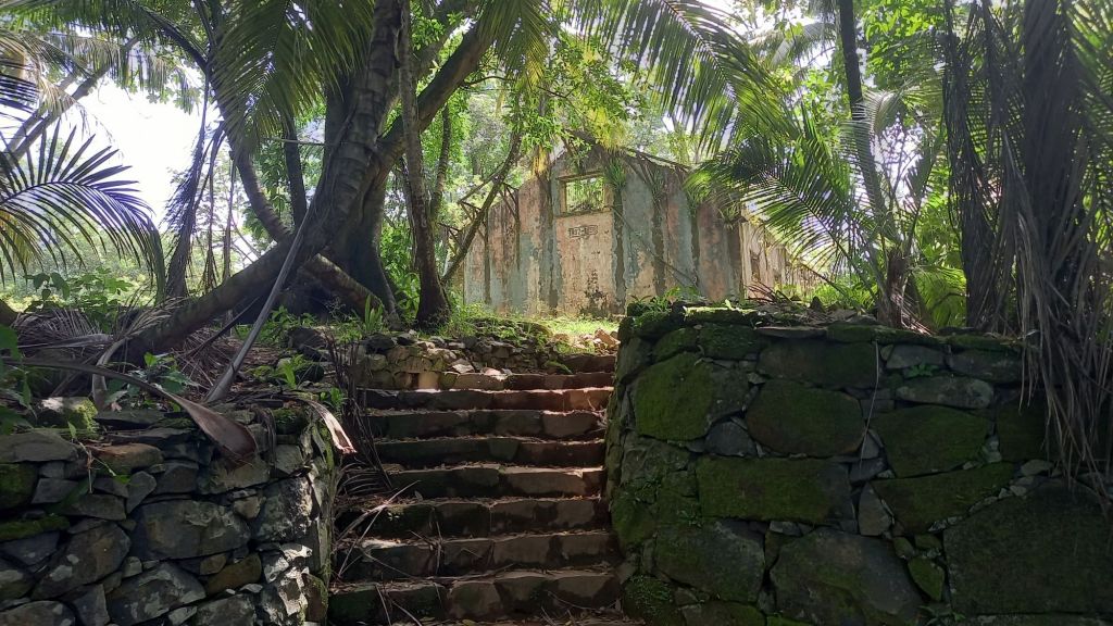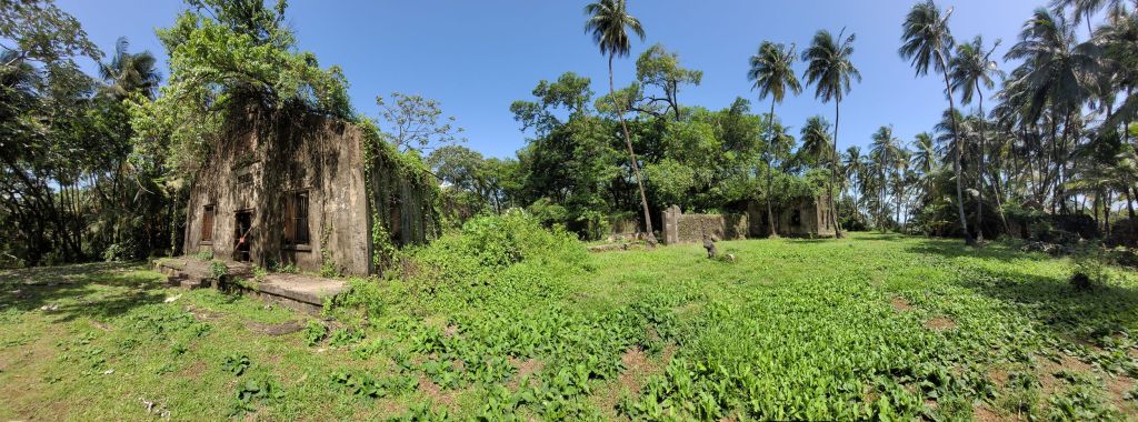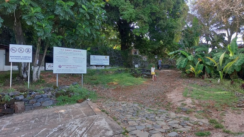 Am Morgen fahren wir den kurzen Hüpfer durch die unruhige Meerenge zwischen den Inseln rüber zur Île Saint-Joseph. Hier gibt es keinen Pier, kein Restaurant, keine herausgeputzten Häuser und erklärende Hinweisschilder. Nur eine ins Wasser führende Treppe, ein kleiner Stützpunkt der Fremdenlegion, ein Rundweg um die Insel, ein Friedhof an der Küste und Ruinen im Dschungel. Das klingt spannend.