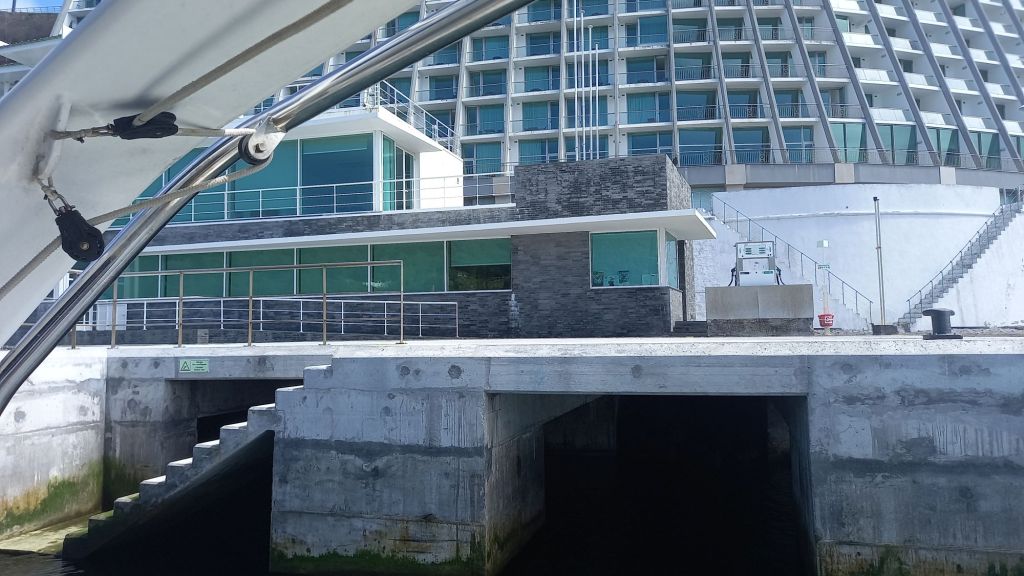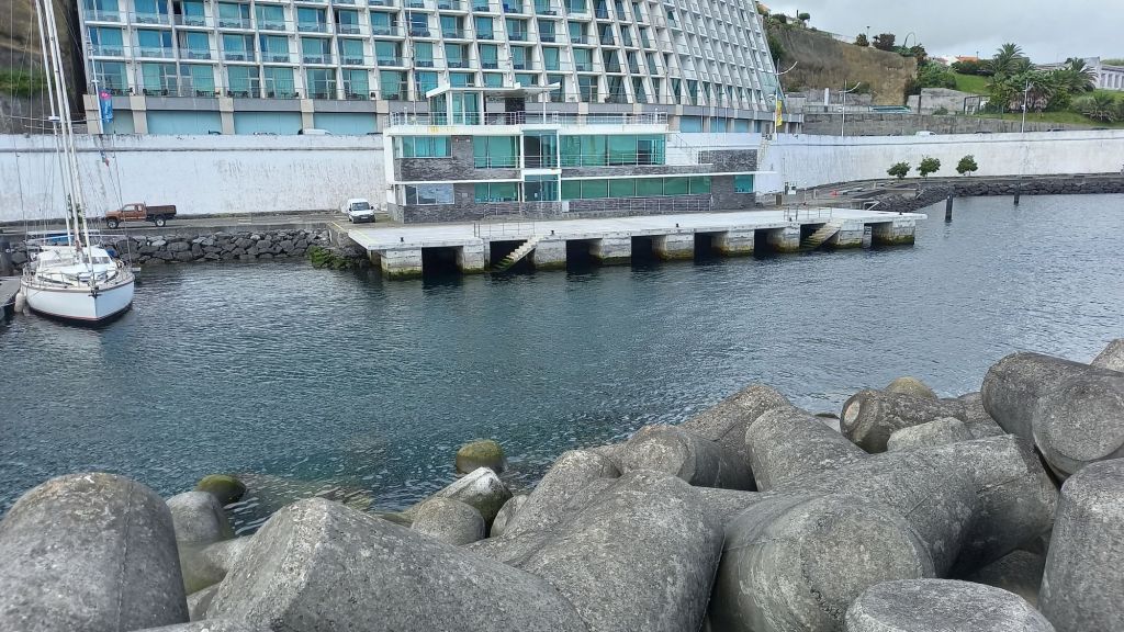 In Praia da Victória empfangen uns wiederum Ankerlieger vor der kleinen Marina. Über Funk wird uns wiederum bestätigt, dass der Hafen voll sei. Nachdem ich unser Dinghy-Problem geschildert habe, solle ich mich in 10 Minuten nochmal melden. Dann die erlösende Nachricht. Ja, er habe einen Platz für uns gefunden. Was für ein Glück. Dabei spielt vielleicht auch rein, dass am heutigen Fronleichnam nur der eine… der richtige Kollege im Büro sitzt. Wir bedanken uns überschwänglich.