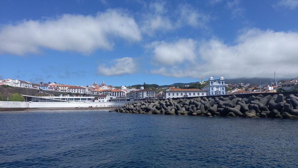 Wir peilen den im Süden der Insel gelegenen Hauptort Angra do Heroísmo an. Allerdings informiert uns die kurz zuvor angekommene SY Sissi, dass der Hafen voll und der Rezeptionssteg furchtbar sei. Mit beidem behalten sie Recht. In Anbetracht unseres Dinghy machen wir trotzdem kurz fest, nur um zu hören, dass der Hafen nicht nur voll sei, sonders das es die nächsten zwei Wochen auch so bleiben werde. Im Ort beginnt morgen Sanjoaninas. Währen der 10 tägigen Festivitäten platzt alles aus den Nähten. Dank mehrerer Regattas auch auf dem Wasser.
