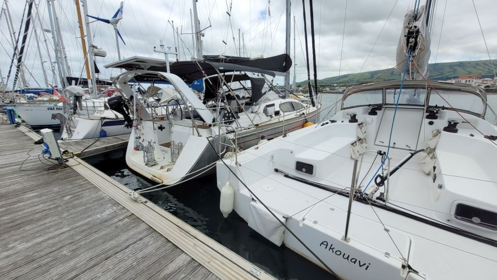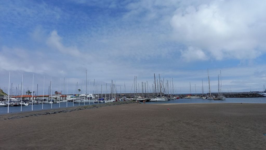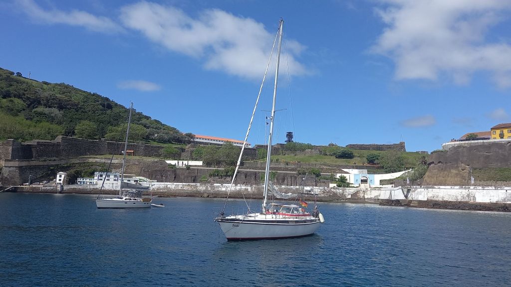 Kaum sind die Leinen fest, werden wir sehr nett von unseren österreichischen Nachbarn der Maeva Piti begrüßt. Und auch die befreundete Sissi ist schon auf dem Weg nach Praia. Die Erkenntnis unserer direkten Weiterfahrt gepaart mit dem Baulärm hat auch sie davon gejagt. Leider bekommt die Sissi keinen Platz mehr im Hafen. Das hält uns jedoch nicht von einem netten Anlegerbier am Abend ab. Willkommen auf Terceira.