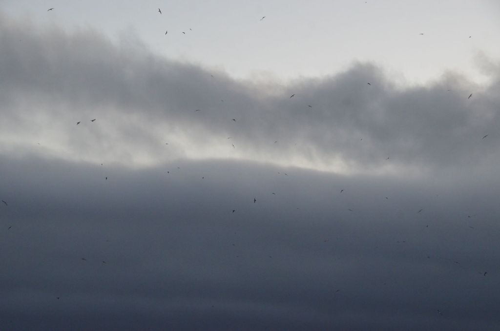 Wir fahren nicht hinein, trotzdem haben wir 6‘er Böen um die 25kn. Damit muss sich der Skipper rumschlagen, während wir das Schauspiel der sich sammelnden Sepiasturmtaucher bewundern. Es werden inzwischen Hunderte. Man sieht sie auch in schwindelerregender Höhe, die wir so von den Sepiasturmtauchern noch nicht gesehen haben. Nur sind sie leider recht leise! Man hört nur sehr vereinzelt und sehr leise Rufe.