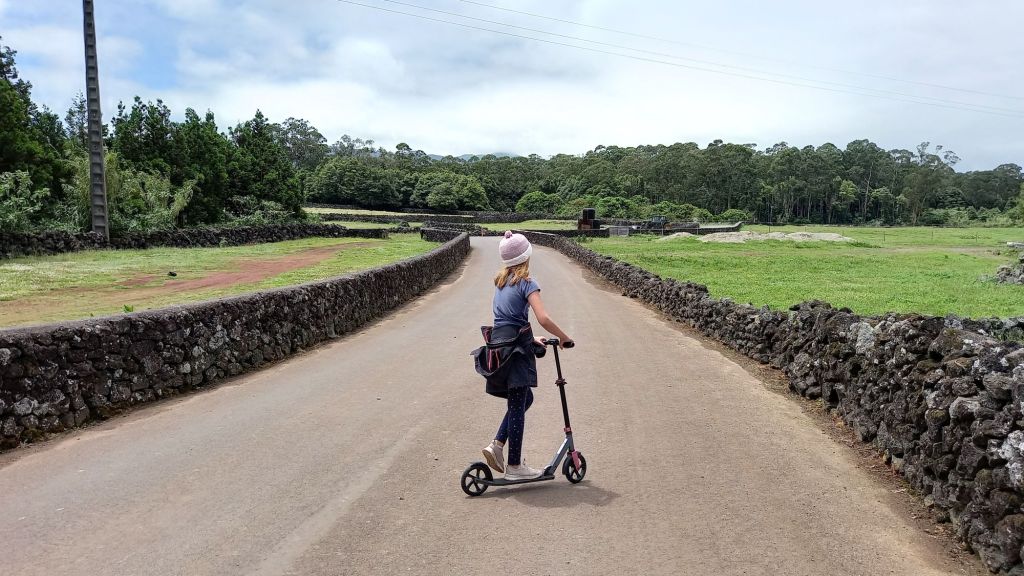 Start und Ziel ist der Grillplatz bei São Brás. Die ersten Meter führen über die Straße. Für die Mädels ist das Argument genug, den Roller mitzunehmen. Sie halten das für eine herausragende Idee. Den Skipper überkommt dagegen eine Vorahnung, bei der das Tragen eines Rollers im Zentrum steht. Alle sollen Recht behalten.
