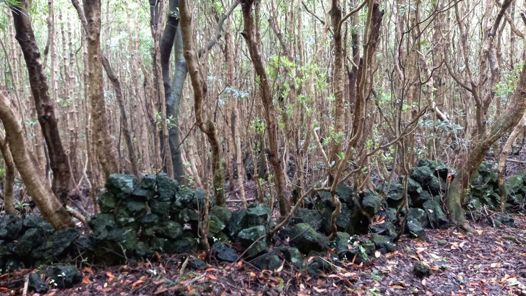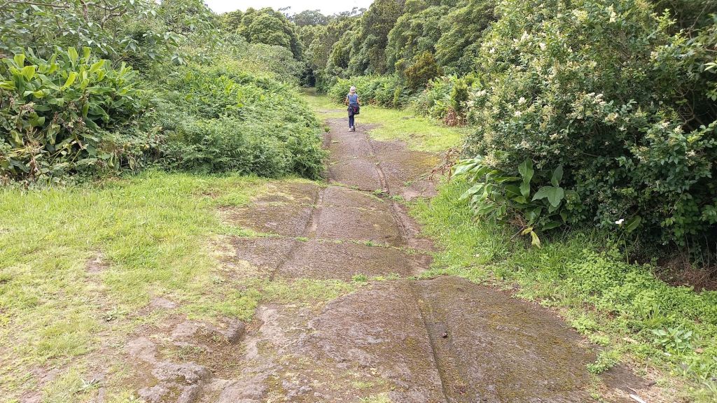 Bald schon biegt der Weg auf einen Feldweg Richtung Wald. Der steinerne Boden ist von den Spuren unzähliger Ochsenkarren durchzogen. Die ältesten stammen aus der Zeit vor 1820. Nägel in den Rädern sorgten nicht nur für besseren Halt, sondern auch schmale tiefe Furchen im weichen Vulkanstein. Die breiteren Furchen sind dagegen jüngeren Datums.