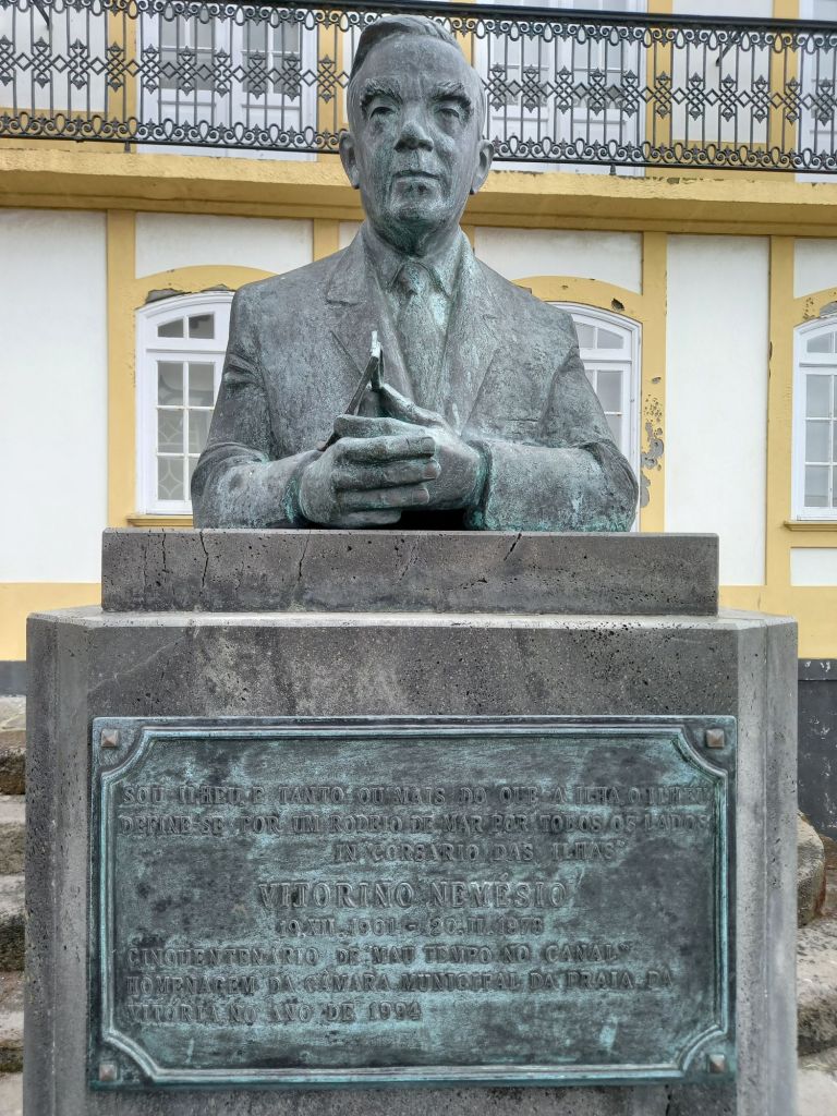Die nach einem Brand im 20. Jahrhundert vollständig wiederaufgebaute Igreja de Senhor Santo Cristo finden wir leider nur geschlossen vor. Wir begnügen uns mit der schönen blau-weißen Fassade. Damit sind wir in Gesellschaft der Büste des bedeutenden portugiesischen Vitorino Nemésio, berühmtester Sohn der Stadt.