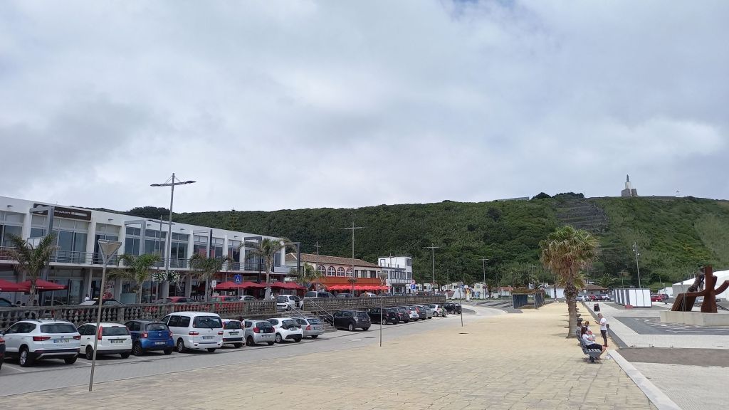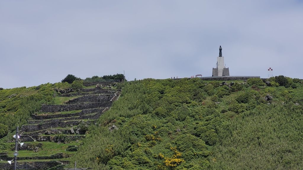 Direkt hinter der Marina wacht die Gottesmutter über Praia da Vitória. Nachts hell erleuchtet stahlt sie vom Miradouro da Facho. Gerne teilen wir ihren schönen Ausblick über die Stadt. Hier oben steht auch ein Modell des Telégrafico Ótico. Zur Zeit des portugiesischen Bürgerkrieges wurden mit den drei verstellbaren Signalen und einem 6-stelligen Code Nachrichten zwischen Praia und Angra ausgetauscht.