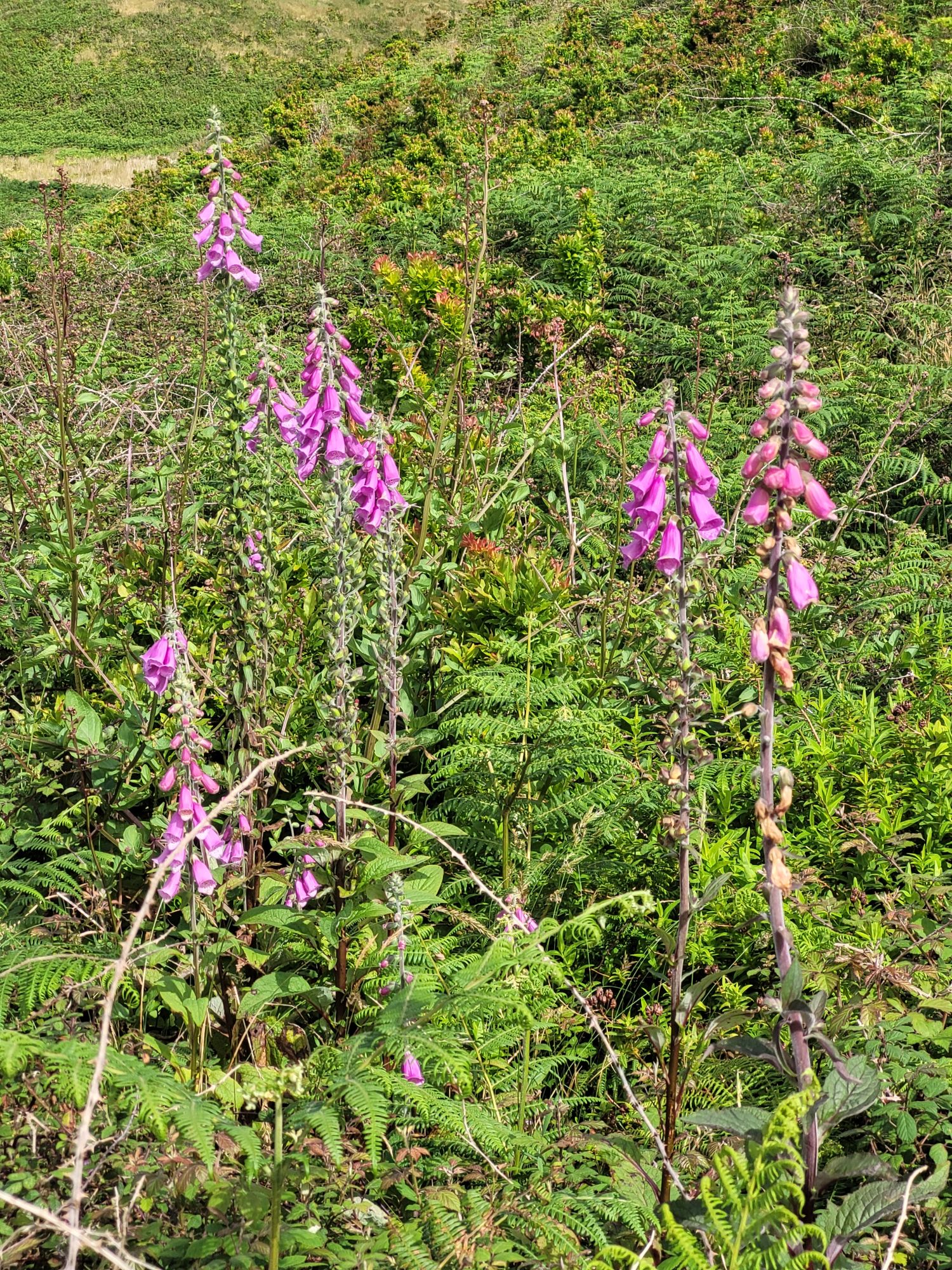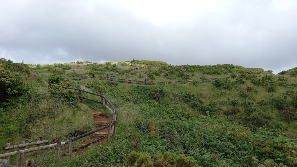 So spazieren wir entspannt herum, schauen immer wieder auf die dampfenden Fumarolen, übersehen aber auch nicht die Flora rundherum. Fingerhut und rosa-weiße Gänseblümchen sorgen für Farbtupfer zwischen den Büschen und Farnen.
