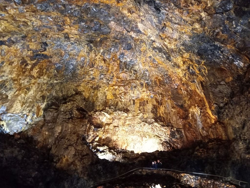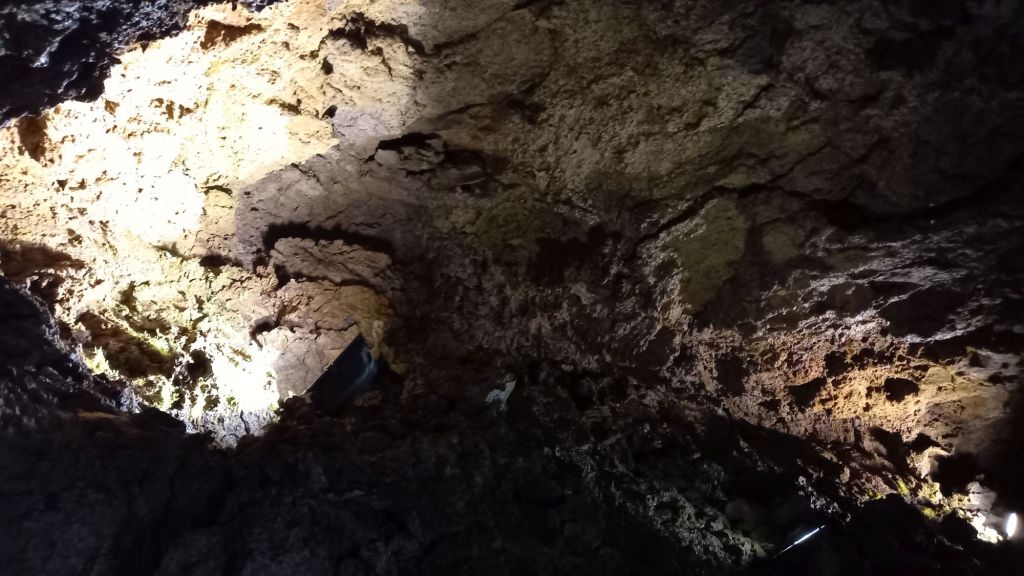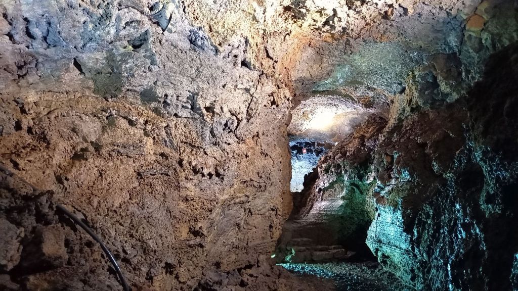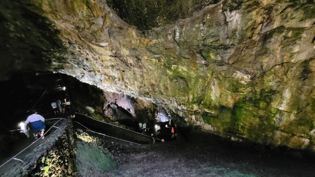 Nur wenige Stufen tiefer sind wir dann auch schon mitten in der Lavaröhre. Zunächst führt der Weg nach links. Bizarre Formationen schmücken die Wände, kleine Lavastalaktiten hängen von der Decke. All das ist stimmungsvoll beleuchtet… und bei jeder Lampe zeugt der grüne Überzug auf dem Stein davon, dass das Leben immer einen Weg findet.