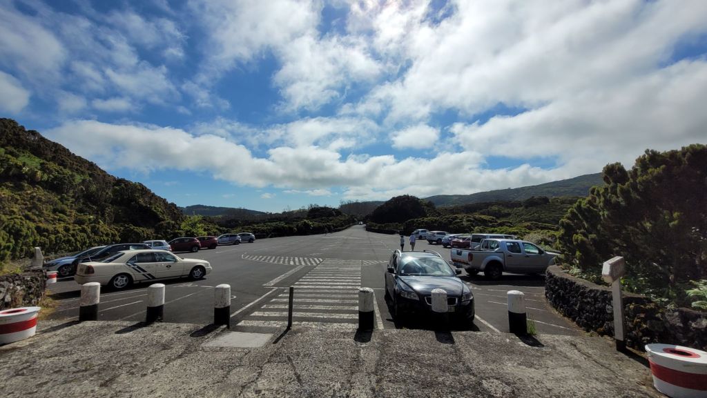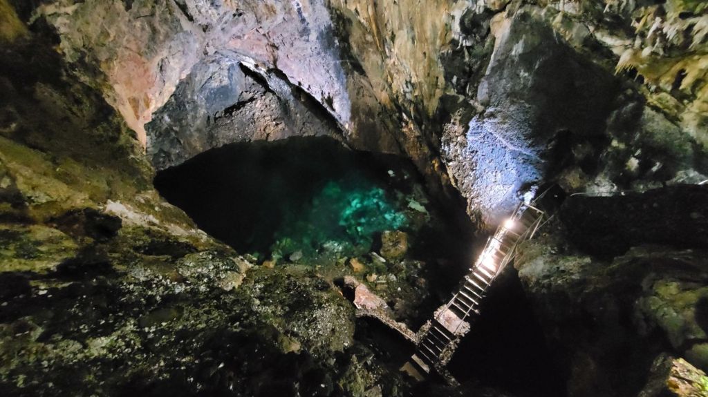 Zum Abschluss der heutigen Inselrundfahrt schauen wir noch bei der zweiten touristisch erschlossenen Höhle, eigentlich ein Vulkanschlot namens Algar do Carvão (Kohlenschlot) vorbei. Kohle gibt es darin jedoch, wie auf der ganzen Insel, nicht zu finden. Den Namen hat der Schlot schlicht wegen seiner dunklen, teils pechschwarzen Wände erhalten.