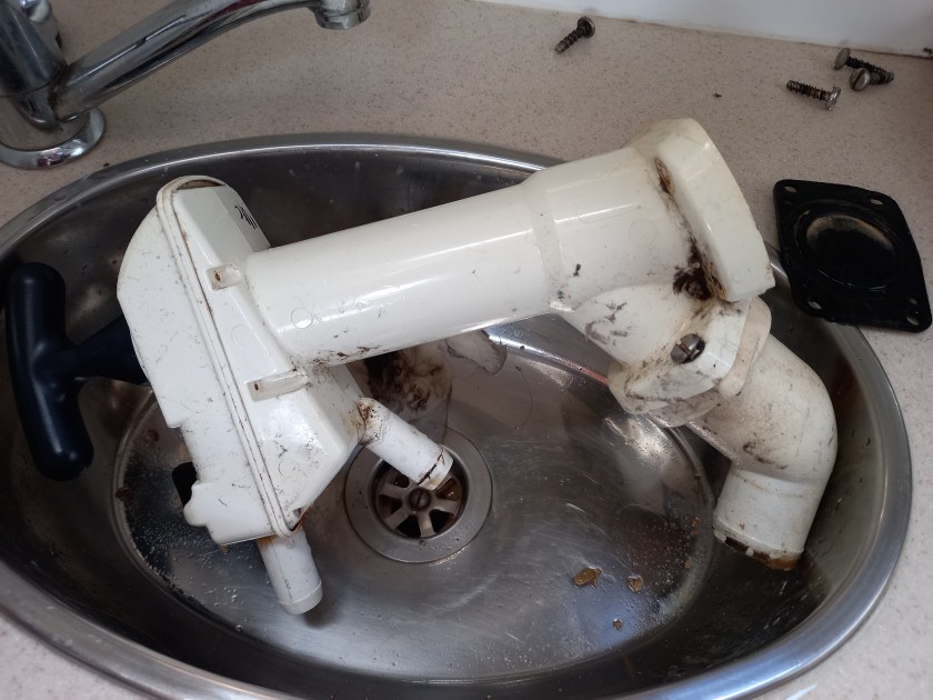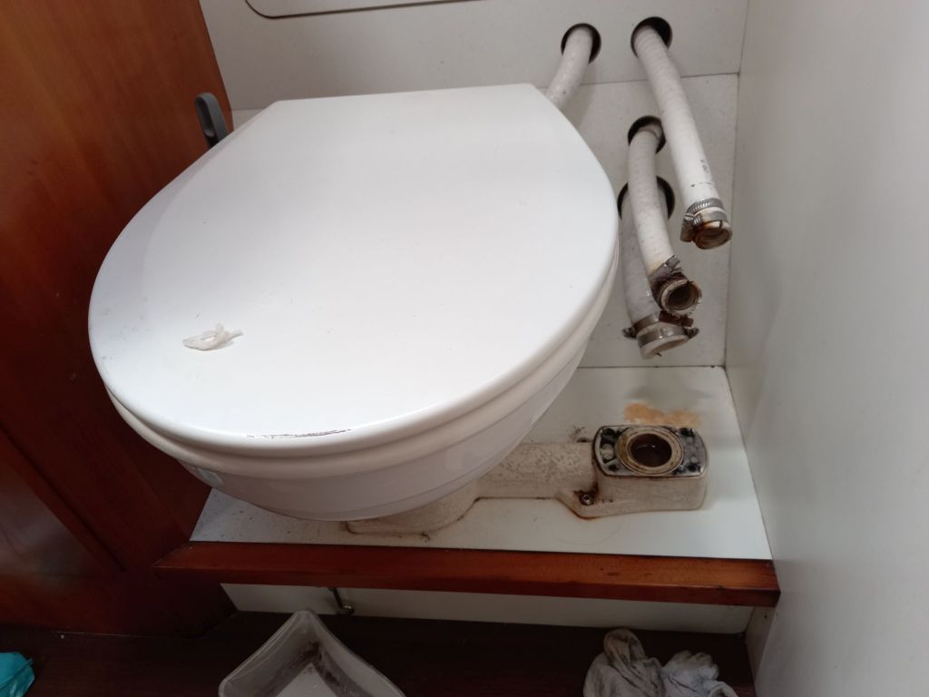 Der Wechsel gestaltet sich unkompliziert. Ist ja nicht das erste Mal, dass der Skipper am Klo rumschrauben muss. Na hoffentlich ist zumindest an dieser Front jetzt mal eine Weile Ruhe. Das Ergebnis stimmt schon mal optimistisch. Wir müssen beim Spülen nun nicht mal mehr den kleinen Umschalthebel nach rechts drücken. Hält von selbst. Dann bleiben ja nur noch locker-über-100-minus-2 Punkte auf der 2do-Liste…