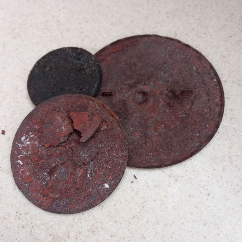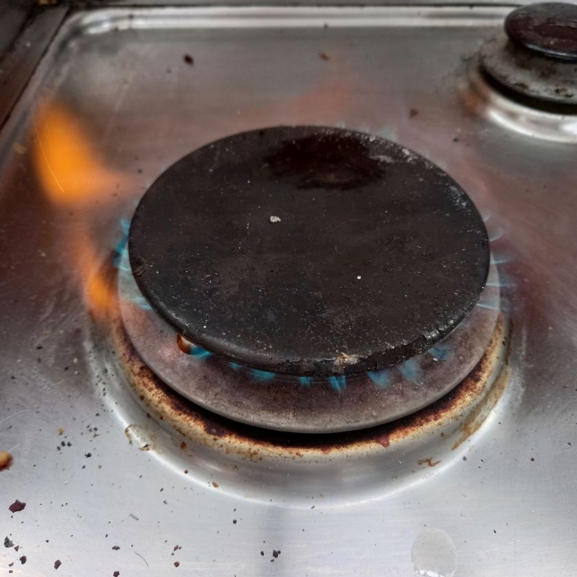 Wobei es sich gerade beim Herdproblem um etwas handelt, mit dem wir so nicht gerechnet haben. Auf den einzelnen Gasfeuerstellen liegt ja eine Abdeckung. In den letzten Jahren ist mir bei diesen jedoch immer mal wieder aufgefallen, dass es innen abbröselt. Scheibe um Scheibe brechen immer mal wieder rostrot-verbrannte Ex-Metallschichten ab. Bis vor Kurzem hatte das keinen sichtbaren Effekt. Nun aber hat sich die Flamme in weiten Teilen von effizient-heißen und vor allem nicht-rußenden Blau in flackerndes Orange gewandelt. Im Gegensatz zu dessen wohligen Schein färben sich die Böden der Töpfe und Pfannen nun aber konsequent rußschwarz.