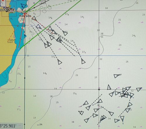 - Allerdings schaffte es auch schon die recht geringe Strömung selbst bei stärkerem Wind unser Boot, bzw. einen Teil davon vor sich her zu treiben… besser gesagt drückte sie unser Heck nach vorne, bis es etwa auf Höhe des im Anker hängenden Bugs war. Damit lagen wir quer zur Welle… und da zählt jeder Zentimeter!
