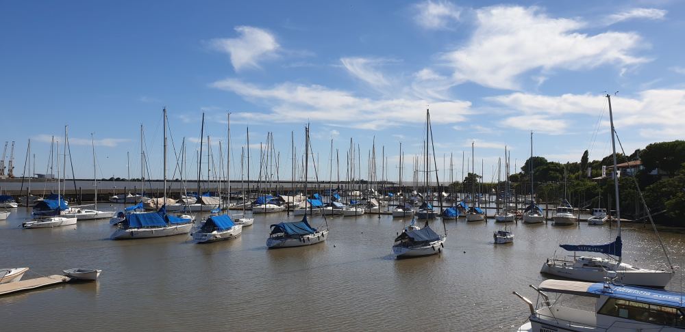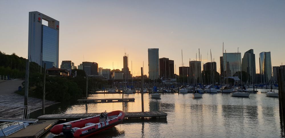 In Buenos Aires selbst gibt es viele Häfen für Sportboote. In Brasilien ist Segeln nicht ganz so verbreitet, aber die Argentinier findet man hier auf den verschiedensten Segelbooten. Die Auswahl ist groß, aber nicht alle Häfen heißen ausländische Boote gerne willkommen. Da wir unser Paket an den ältesten, traditionellsten Segelclub versendet hatten, lag unser Ziel dort. Er lag direkt am Ende der langen betonnten Einfahrt und wir kamen natürlich wieder abends an. Das ist nicht wirklich mein favorisiertes Zeitfenster, aber es hilft ja nichts. Mit Erschrecken stellte ich fest, dass in der Einfahrt eine Art Sperre lag. Was??? Der Hafen ist gesperrt?? Oh nein. Tausend Gedanken im Kopf, aber leider keine zielführenden. La Skipper in heller Aufregung, aber der „alte“ versierte Skipper sprach, dass wir uns das erstmal von der Nähe aus ansehen könnten. Zeit für Panik ist dann noch genug. Und tatsächlich war es eine Sperre, aber sie ging von allein auf. Aha. Drinnen erwartete uns ein freundlicher nur spanisch sprechender Wachmann, der uns dann nach einigen Kommunikationsproblemen einen Liegeplatz gab und uns beim Anlegen half. Danach ging die Unterhaltung dank Google Translate deutlich besser. Hier in Argentinien gibt es die Besonderheit von: Cortesía Das bedeute, dass man eine gewisse Zeit kostenlos liegen kann. Dieser Zeitraum war bei diesem Club zwar nur 48h, aber egal. Wir waren da! Endlich in Argentinien.