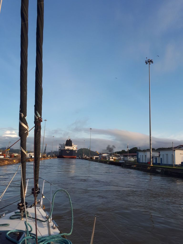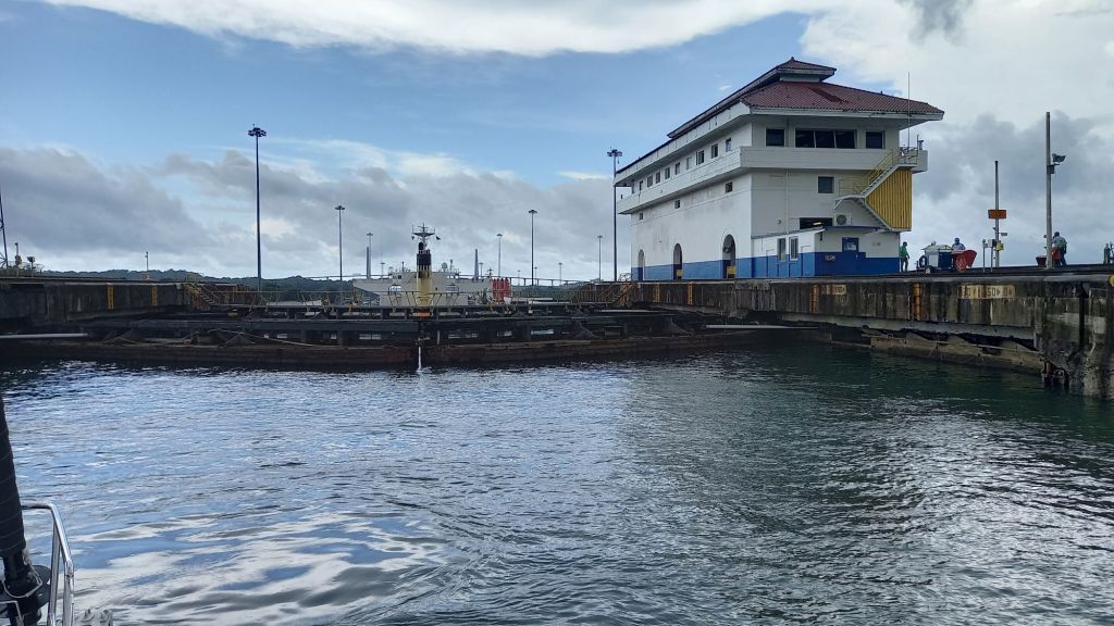 Mit dem Bau des im Jahre 1914 eröffneten Panamakanals wurden alle Landbrücken zwischen Nord- und Südamerika abgebrochen. Heute verbinden lediglich drei Brücken die Kontinente. Zwei davon stehen auf der Pazifikseite. Als ersten unterqueren wir die 1962 in Betrieb genommene Puente de Las Américas, auf der nach Ende der nächtlichen Ausgangssperre allmählich der Verkehr zu Rollen beginnt. Wir fahren entspannt durch den großen Industriehafen „Puerto de Balboa“ zur ersten Schleuse. Für die meisten Segler ist die Esclusa Miraflores das ersehnte Tor zum Pazifik. Für uns ist es dagegen der definitive Schritt zurück Richtung Europa. Perspektivenwechsel.