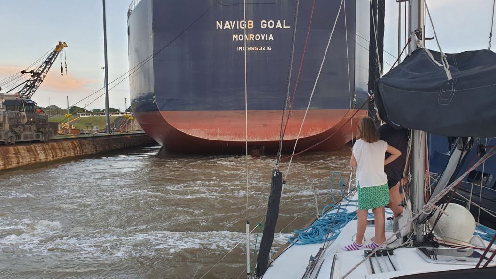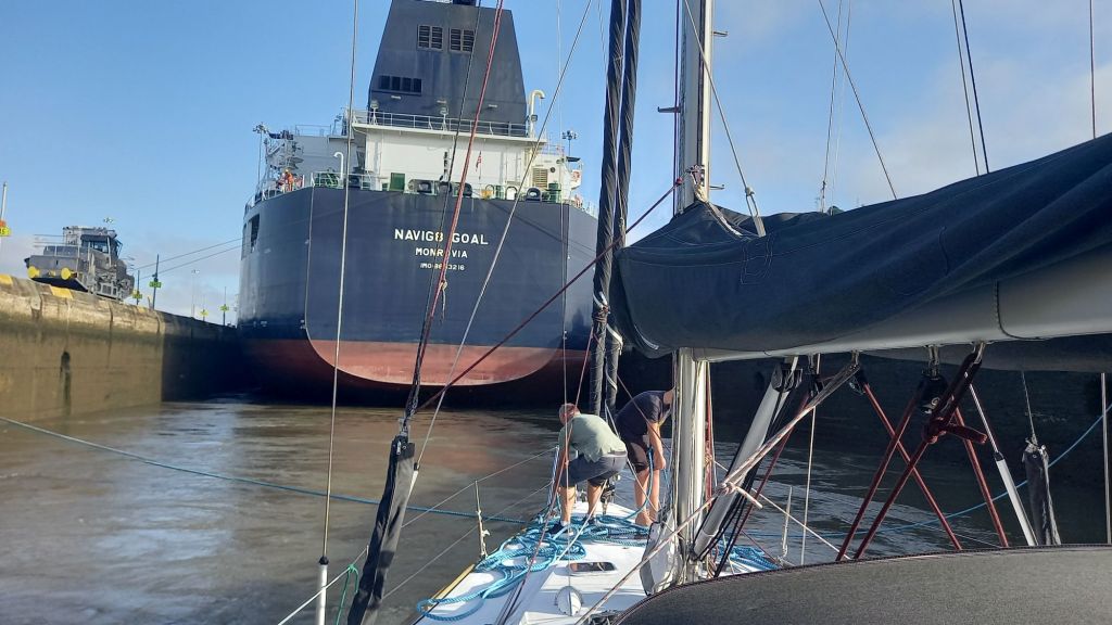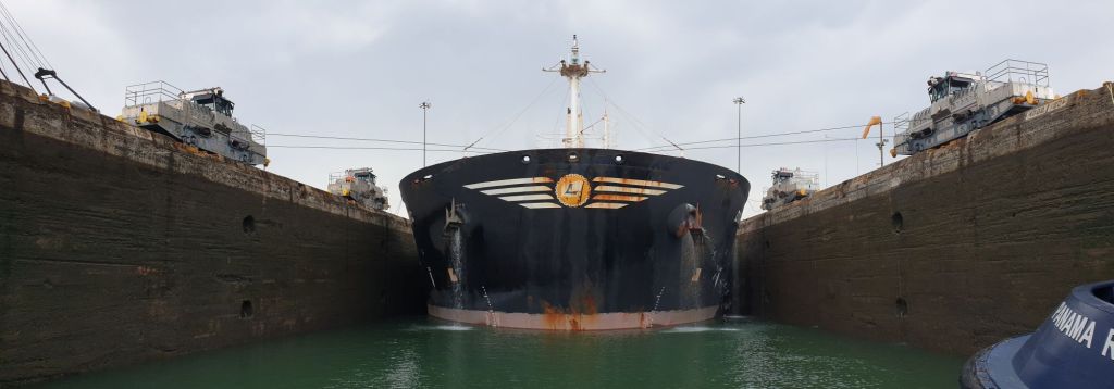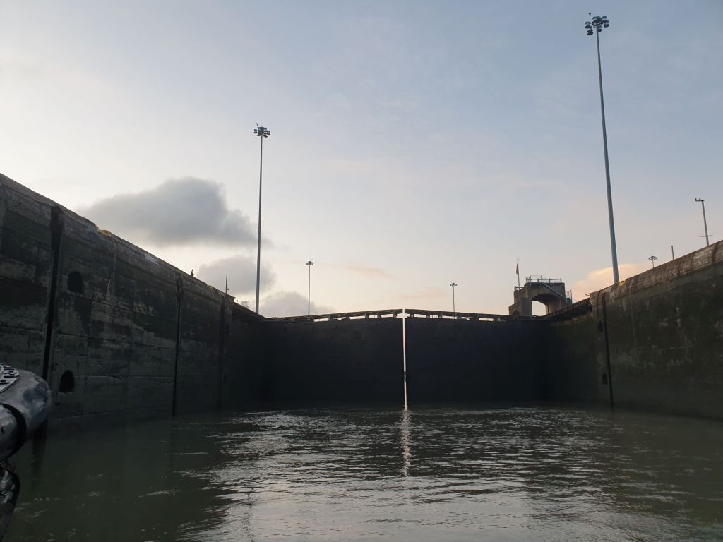 Um halb sechs geht es los. Die Tore stehen offen und wir fahren hinter dem Chemietanker „Navig8 Goal“ (sic!) in die erste der insgesamt sechs Schleusen, die heute auf dem Programm stehen. Noch wissen wir nicht, wie genau wir geschleust werden. Es gibt grundsätzlich vier Optionen: