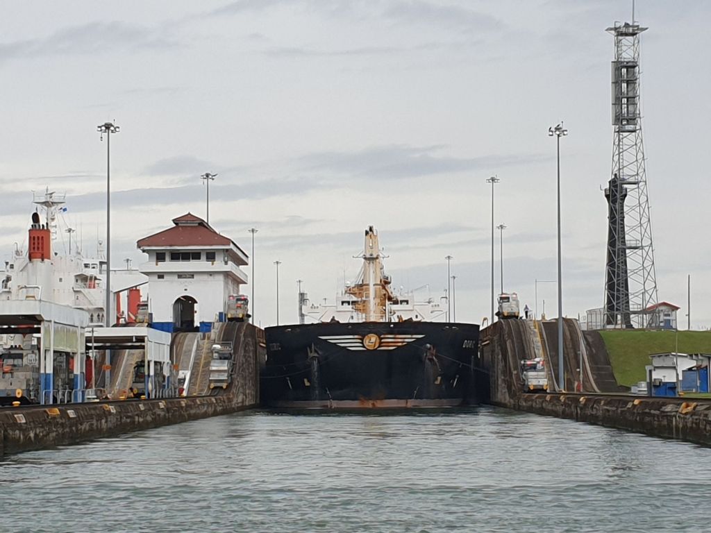Zwei Stunden später, kurz vor drei Uhr, geht es auch für uns endlich weiter. Wir liegen zusammen mit der „Doric“ in der ersten Kammer der Esclusas de Gatún auf Atlantikseite. Wieder haben wir das Glück, mit einem Schlepper durchzufahren. Dazu liegen wir nun vor dem Frachter. Damit bleiben uns die Verwirbelungen der Schraube erspart.