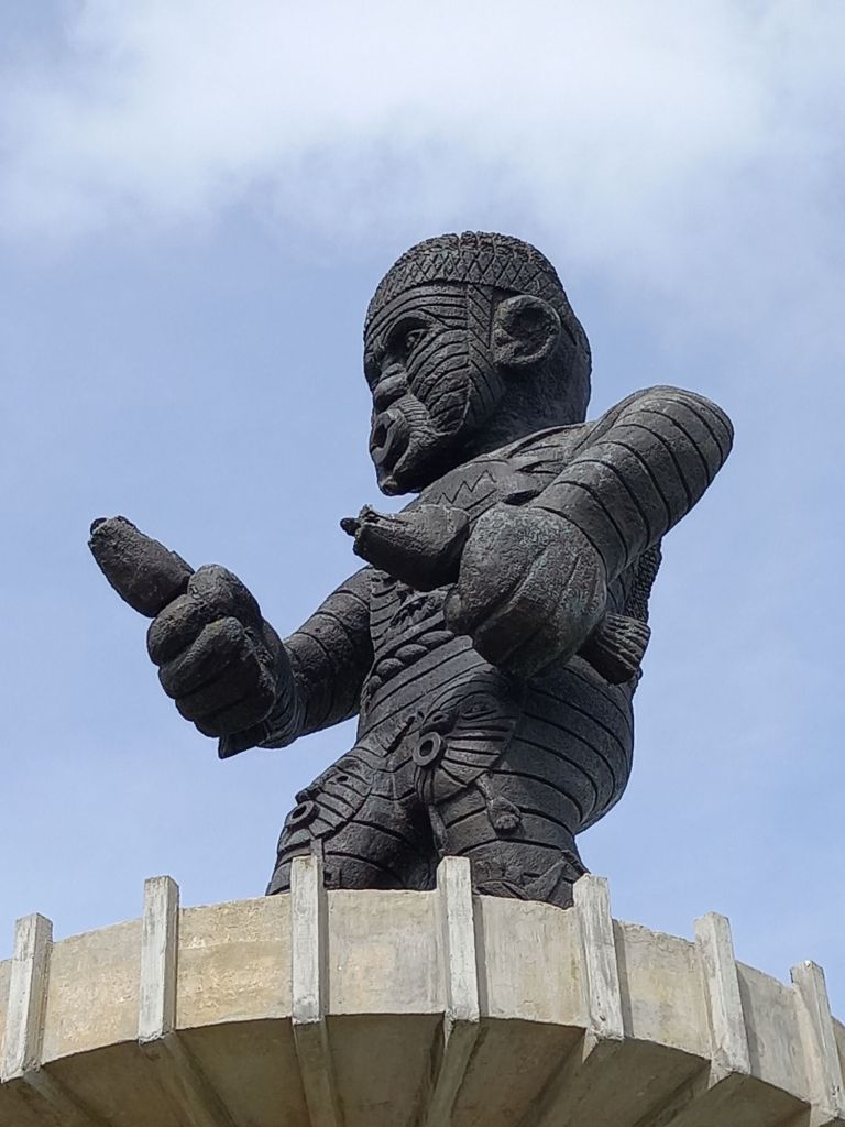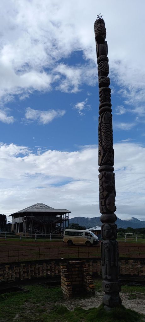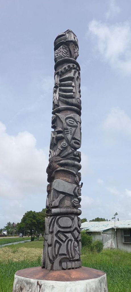 Danach kommt der touristische Teil unserer Stadtrundfahrt. Am Ausgang der Parks steht ein Totem. Zumindest ist diese ursprünglich aus Nordamerika kommende Tradition wie schon in Surama auch hier von lokalen Künstlern mit landestypischen Motiven gestaltet.