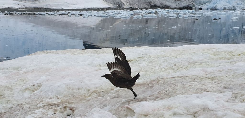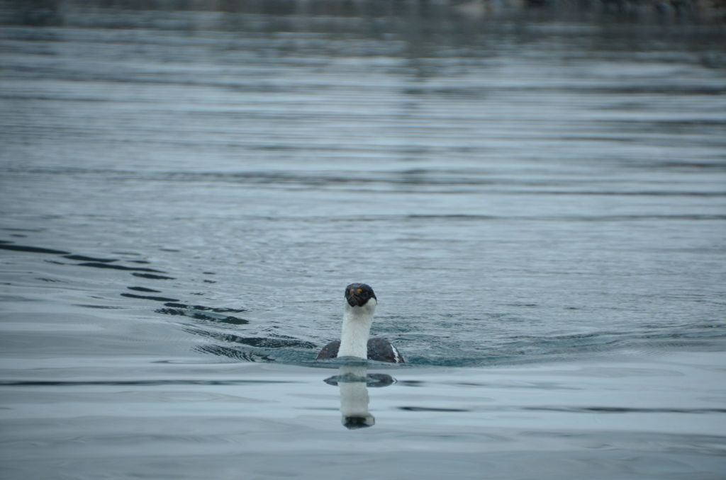 Ich beobachte den Vogel solange, bis sich ein weiterer Vogel nähert. Er sitzt einfach so auf einem Ast, der mitten im offenen Meer herumtriebt. Er hat längere Beine und ein gräuliches Gefieder.