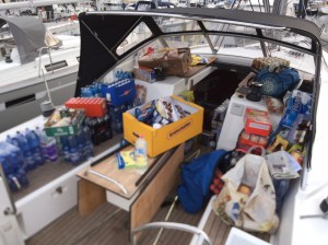 Dazu gehört sicherlich auch das Bunkern von Proviant. In wenigen Stunden schon heißt es „Leinen los“ Richtung Norwegen. Und dieses Land ist wahrlich alles andere als preiswert. Also werden die einheimischen Discounter geplündert und unsere Samai liegt nun einige Zentimeter tiefer. Das Bild zeigt den Zustand vor dem Einräumen… nur die ohnehin schon unterbrochene Kühlkette eines kleinen Teils der Einkäufe wurde da schon wieder hergestellt. Das wirklich faszinierend ist aber immer wieder, wie all diese Sachen sang und klanglos in den Stauräumen verschwinden… und manchmal findet man bei solch einem Einräumen auch nette Kleinigkeiten, von denen man schon vergessen hatte, dass sie an Bord sind ;-)